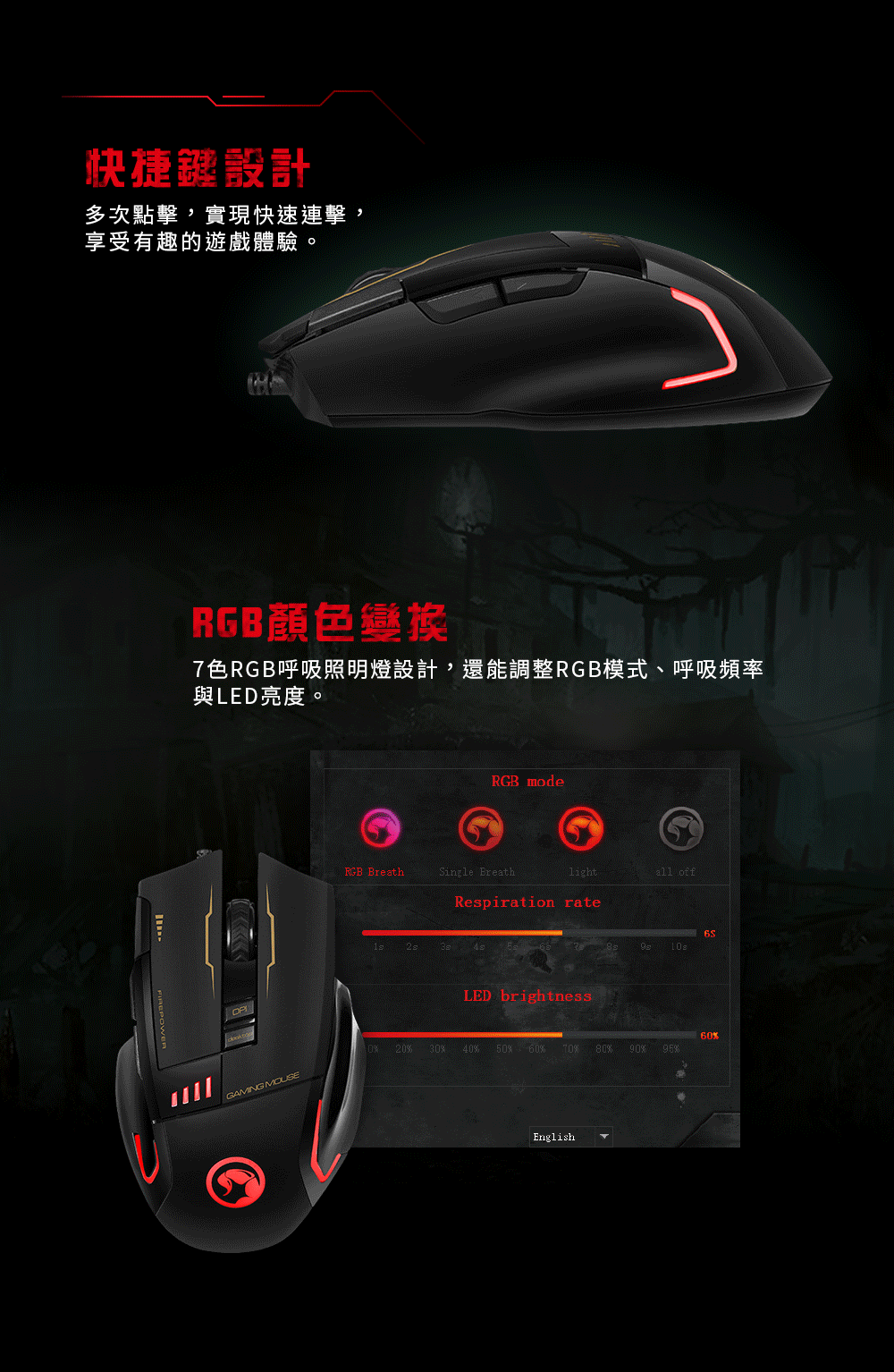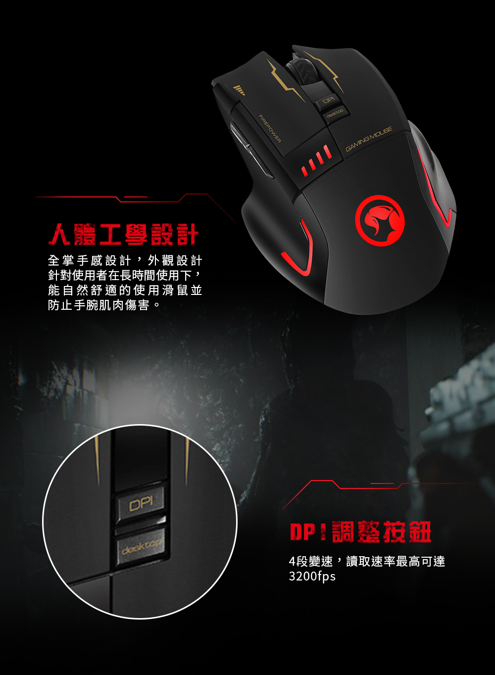 滑鼠規格 感應器:光學 DPI:800-1200-1600-3200 可編程按鈕:8個 滾輪速率:250/500/1000 Hz 背光:7種顏色 行程壽命:300萬次 額定電壓:5V 額定電流:100mA 電纜長度:1.8m 連接:USB 2.0 (編織線) 尺寸:125 x 78 x 39 mm 重量:160±10 g